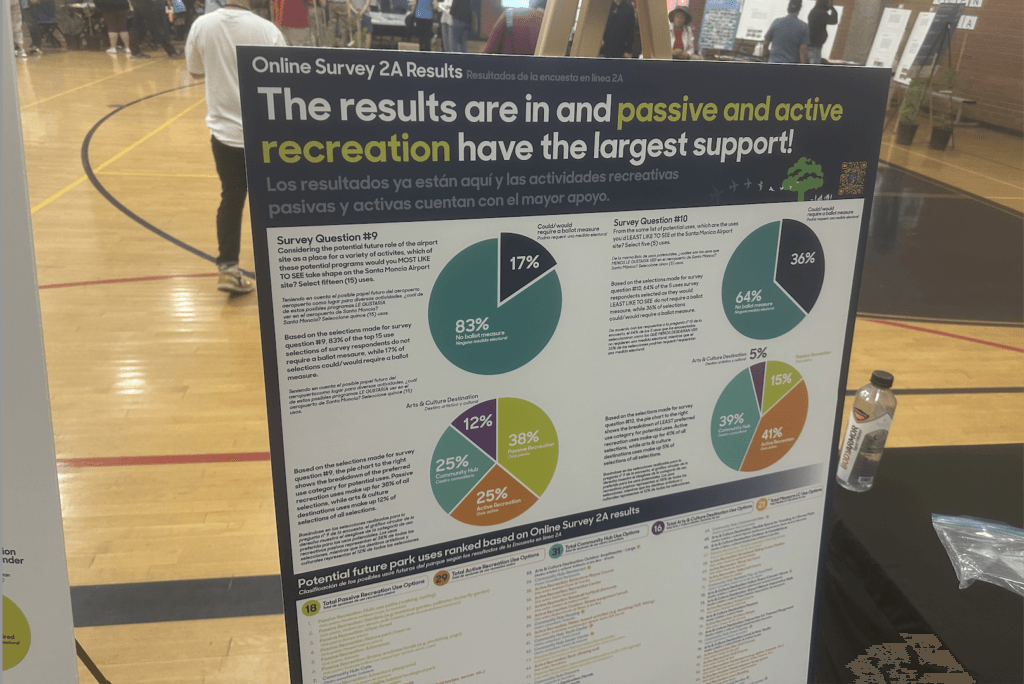 Which is not to say that the “usual suspects” weren’t present as well. The “Great Park Coalition,” a group of advocates pushing for nearly all of the airport land to be used as park and open space, had a tent set up outside the entrance to sign up new supporters and talk to people before they saw the presentation by Sasaki and city staff and to make one last effort to persuade folks that any future use for Santa Monica Airport should be about building a great park, not about providing more housing opportunities. The aforementioned attendance spurred on by schools wasn’t a coincidence, as the academic community sees an opportunity to expand their sports, science, and cultural programming. And even a short walk through the room saw more than a handful of shirts and hats for various neighborhood and political organizations.