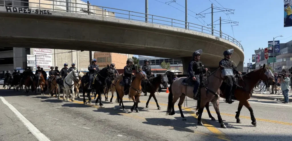 Twice a phalanx of 20 mounted LAPD officers made their way through the intersection at Alameda and Aliso. The (temporarily closed) Metro A Line track is visible above.
