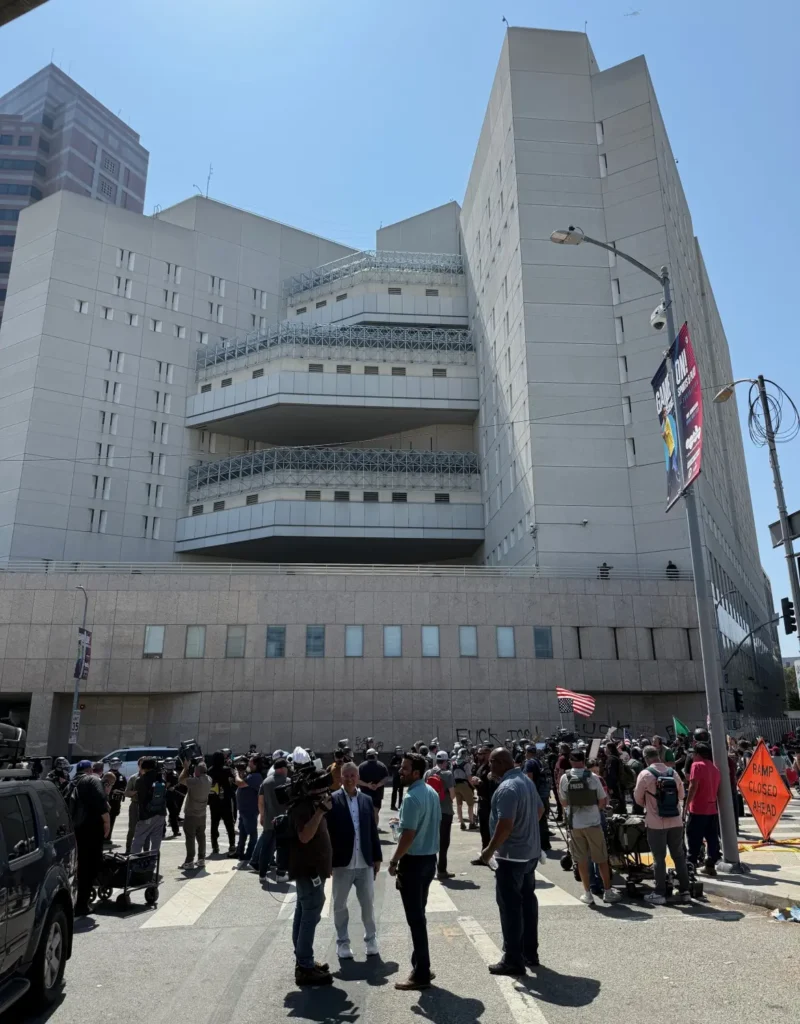 The federal Metropolitan Detention Center in downtown Los Angeles. For five days protesters have gathered here, and law enforcement has closed the streets on three sides of the federal building complex the jail occupies.