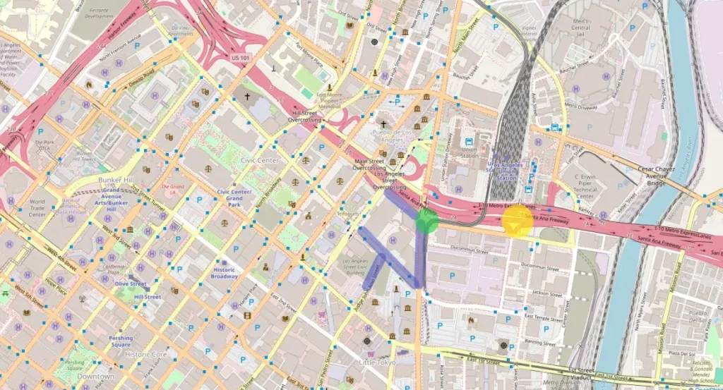 Most central Los Angeles protest and police activity has been in a half-dozen block area on the east side of downtown Los Angeles. Law enforcement has closed several blocks highlighted in blue above. A main protest location (green circle) is the intersection of Alameda Street, Aliso Street, and Commercial Street – along the east face of the Metropolitan Detention Center, and just south of L.A. Union Station. This afternoon protestors entered the 101 Freeway at the Commercial/Vignes/Alameda ramps – shown in the yellow circle above.
