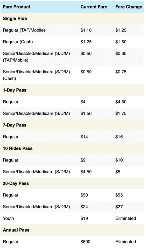 - Increasing the cost of Single Ride, 1-Day, 7-Day, 10 Rides, and 30-Day Passes