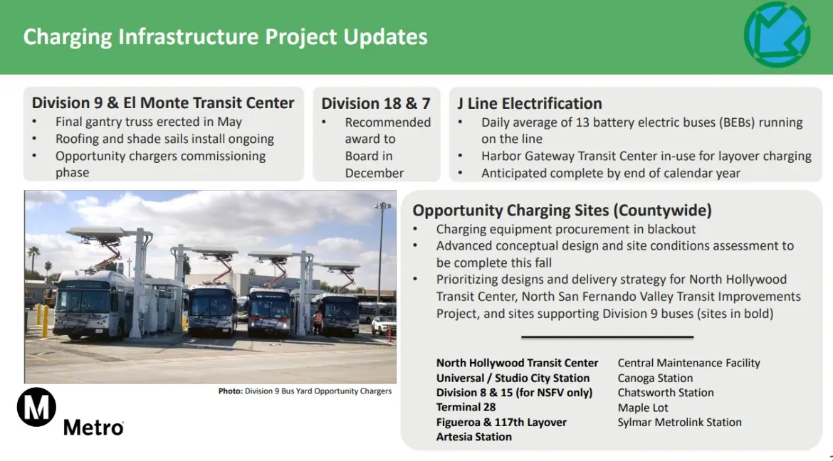 Board committees approved funding for electric buses this month. The Operations Committee approved the purchase of 80 new electric buses [staff report]. The Construction Committee approved installing electric bus charging infrastructure at two Metro bus yards [staff report].