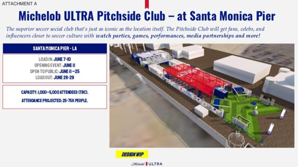 Under the proposals, a World Cup fan festival could take place at the Santa Monica Pier in June 2026, featuring match viewing, branded experiences, live broadcasts, food and beverage options, and fan programming. The activation would occupy the Pier and adjacent areas for about three weeks, drawing thousands of visitors during Los Angeles-area matches.