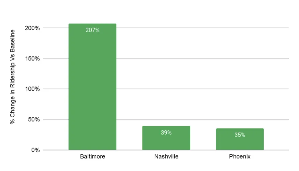 The League of American Bicyclists, working with the mircromobility outfit Lime, recently reported a whopping 207-percent increase in shared bike and scooter trips along corridors where the city of Baltimore had installed new protected bike lanes. Nashville (39 percent) and Phoenix (35 percent) also reported significant jumps along their latest protected cycling corridors — growth that the study authors say only seems modest because of factors like the time of year they were installed, or the presence of other micromobility operators that shared the market with Lime.