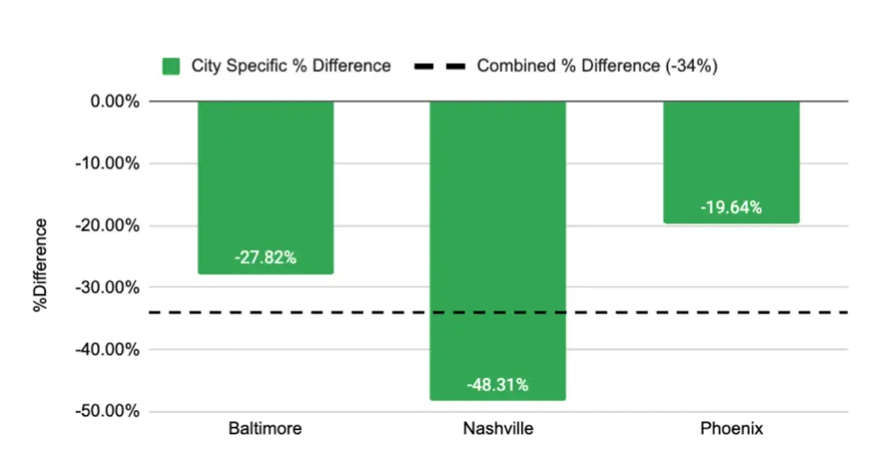 Haydu explains that Charm City, Music City and The Valley of the Sun were all included in this analysis because their transportation officials competed for the funding and technical assistance necessary to do it — a competition that they won, in part, because the company thought each was representative of car-dependent metros across America that are striving for bike friendliness. But he says that Lime works with communities to understand their micro-mobility data outside of contests, too, and that it can be a powerful complement to rider surveys that often undersell the public desire for new bike lanes.