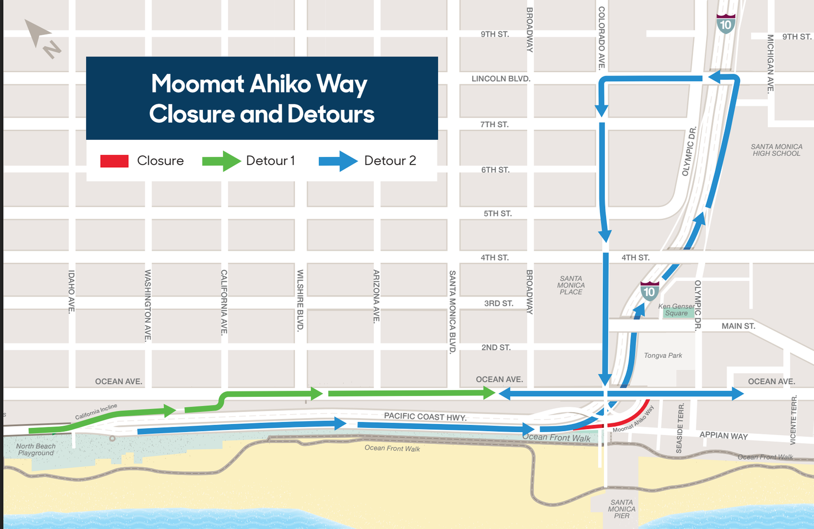From southbound PCH, continue to northbound I-10. Exit Lincoln Ave and turn left. Turn left on Colorado Ave. and continue to access Ocean Ave.  A map of suggested detours is available here